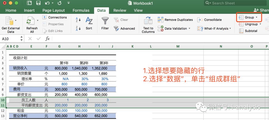 组成群组后,只要单击显示在行旁边的减号,组成群组的部分就会像下表一样收合起来,并显示出加号的按钮。