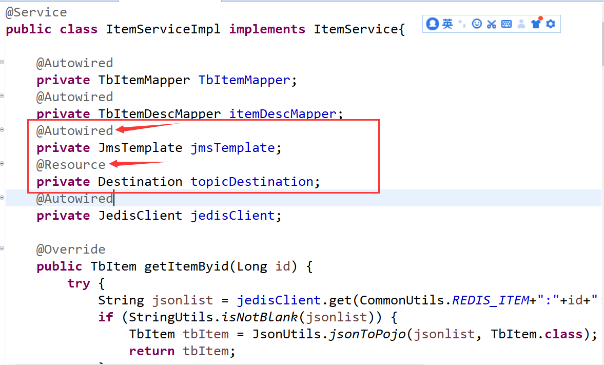 上图中由于我们再配置文件中配置了两个Destination,一个是queue,一个是Topic,所以我们采用@resource注解,首先根据Byname 方式 topicDestination查询配置文件中的id进行自动装配。