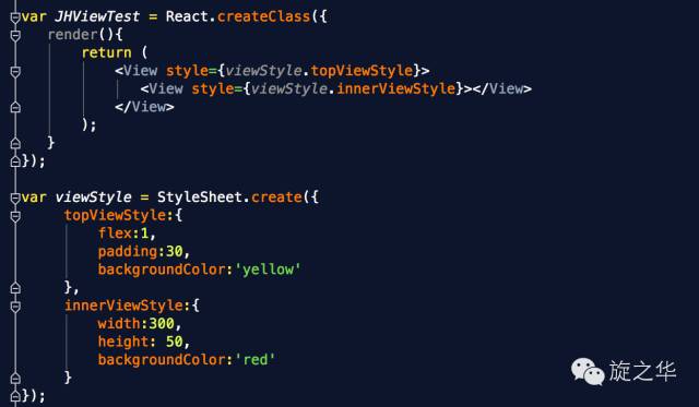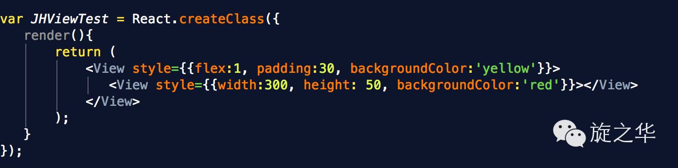 在顶层的View中的style属性里面设置了其占满父控件,内边距为30,背景颜色为黄色 ;对应子层中的View的style属性中设置了宽度300,高度50,背景色为红色。 这是我们熟悉的css写法。