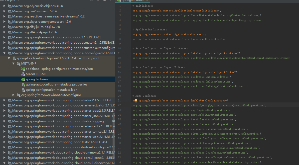 //自动配置幕后英雄:SpringFactoriesLoader 其主要功能就是从指定的配置文件META- INF/spring.factories加载配置