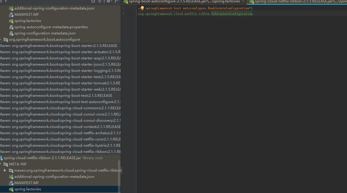 在看看比如spring-cloud-netflix-ribbon 中的spring.factory 只有一个RibbonAutoConfiguration