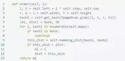 因为这是类的一个方法,所以有个self参数,无视它。这里的img应该传入一个Image对象,可以使读入图像文件后的结果,也可以是截屏后的结果。而缩放的尺寸(18,13)是我根据实际情况定的,因为顾客头像上的菜的图像基本就是这个比例。事实证明这个比例还是挺重要的,因为我们的菜有点儿相似,如果比例不合适压缩后就失真了,容易误判(我之前就吃亏了)。