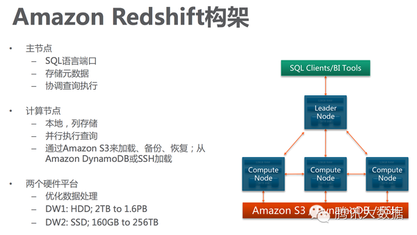 Amazon RedShift是 ParAccel一个版本。它是一种(massively parallel computer)架构,是非常方便的数据仓库解决方案,SQL接口,跟各个云服务无缝连接,最大特点就是快,在TB到PB级别非常好的性能。它还支持不同的硬件平台,如果想速度更快,可以使用SSD。