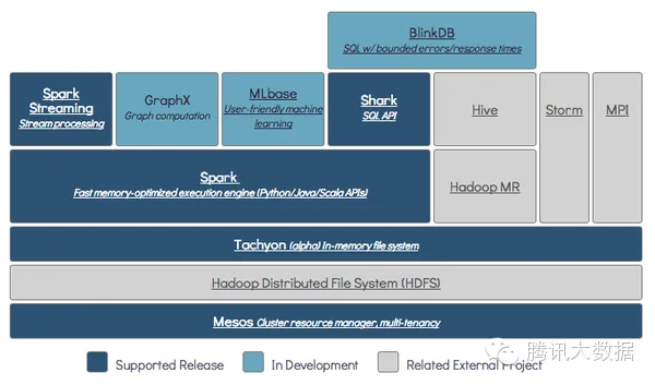 上面说道Spark,在Berkeley AMP lab 中有个更宏伟的蓝图,就是BDAS,里面有很多明星项目,除了Spark,还包括: