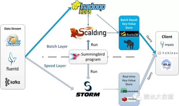 Lambda架构的问题要维护两套系统,Twitter开发了Summingbird来做到一次编程,多处运行。将批处理和流处理无缝连接,通过整合批处理与流处理来减少它们之间的转换开销。下图就解释了系统运行时。