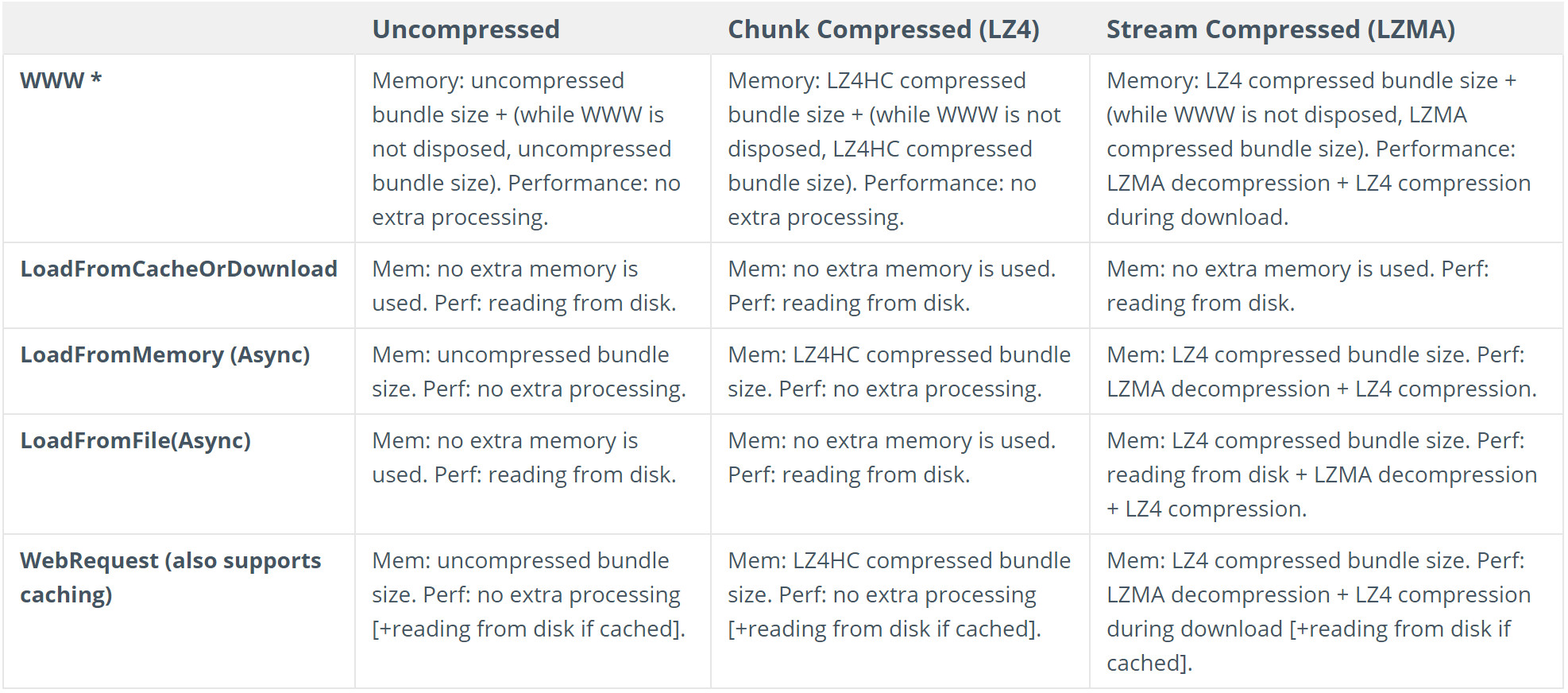 1)LZ4 的AssetBundle bytes通过LoadFromMemory加载时,则直接转换成LZ4的AssetBundle来进行使用;而UnCompressed和LZMA则会被压缩成类似于LZ4的其他参数格式,所以内存会有所偏差。