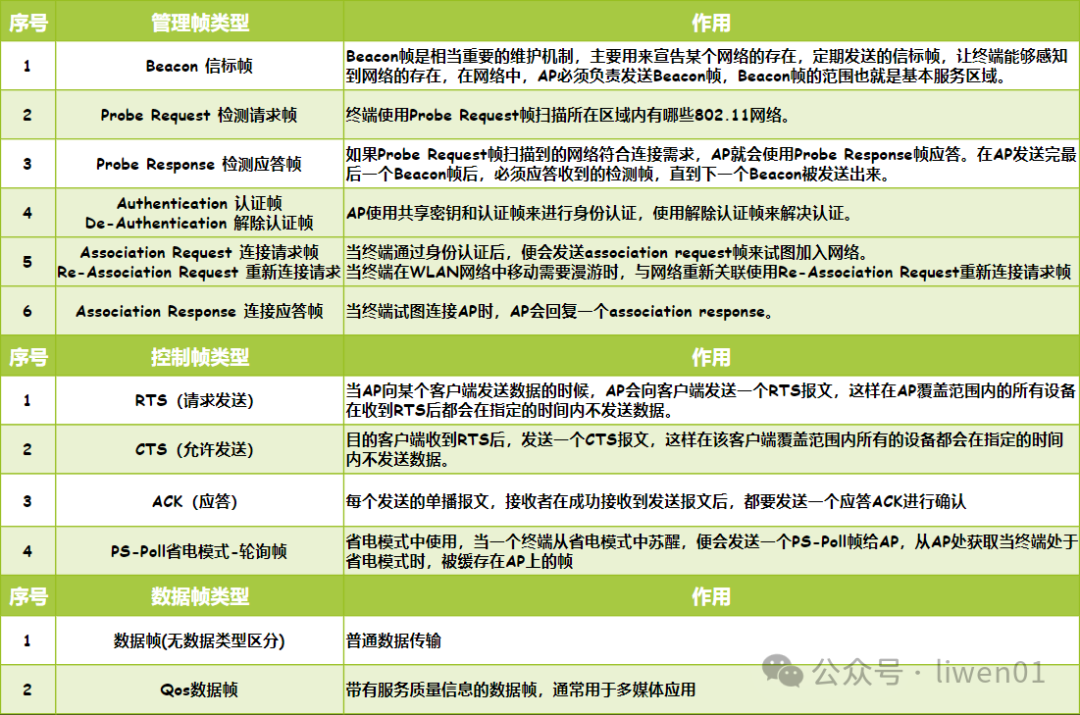 802.11 无线 WiFi 网有三类帧:数据帧、管理帧、控制帧。与有线网相比,无线 WiFi 网会复杂很多。大部分应用软件开发对 WiFi 的控制帧和管理帧了解得并不多,因为它们在物理层和数据链路层就已经被处理了,上层应用很少能感知到。