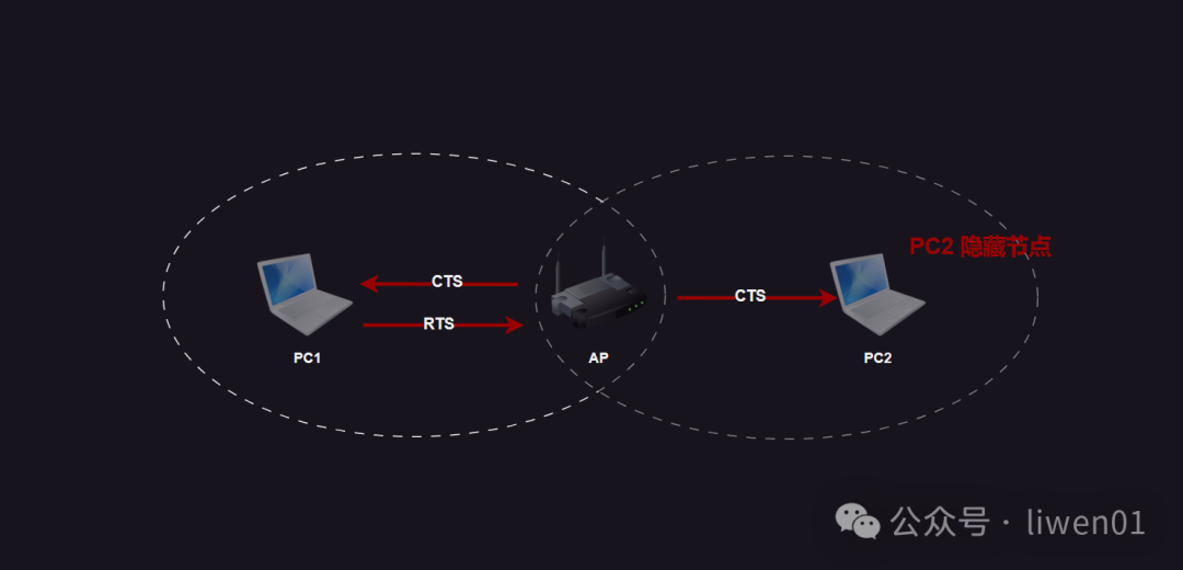 - PC1 要发送数据,所以它发送了 RTS 帧, 这时路由器可以收到该 RTS 帧,但是 PC2 与 PC1 距离较远,PC2 收不到 PC1 的 RTS 帧。