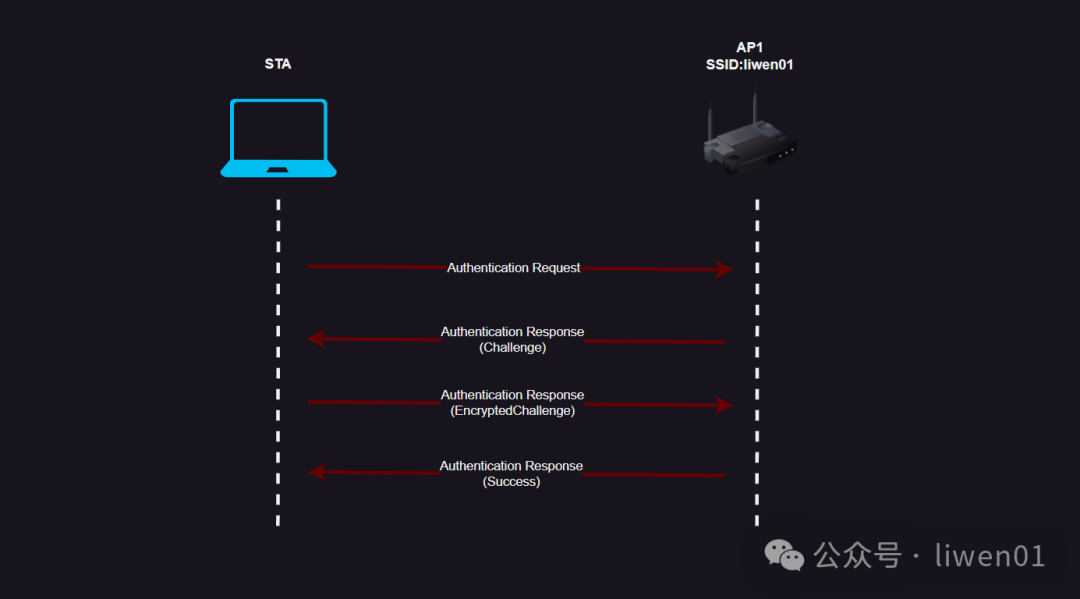 共享密钥认证 (Shared Key Authentication):设备和 AP 会通过 WEP (Wired Equivalent Privacy) 密钥进行加密认证。这种方式现已很少使用,因为 WEP 的安全性较差,已被更强的 WPA/WPA2/WPA 3等认证方式取代。