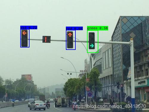 数据集中的红灯比较多,所以训练结果中红灯的置信度为0.60和0.72,绿灯样本较少,识别的绿灯的置信度为0.38,整体效果还算可以。