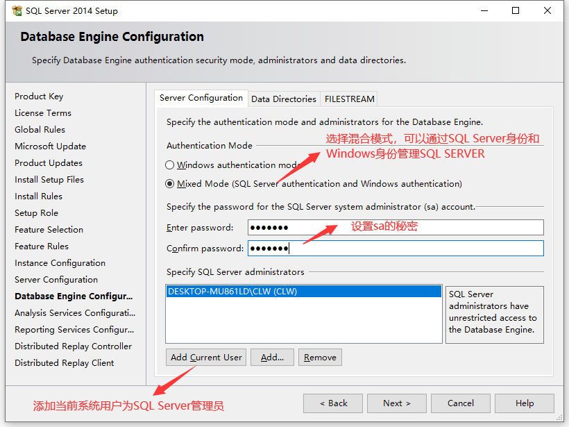 12. 进入数据库引擎配置项。选择混合模式并设置sa密码,添加当前用户为SQL Server管理员。