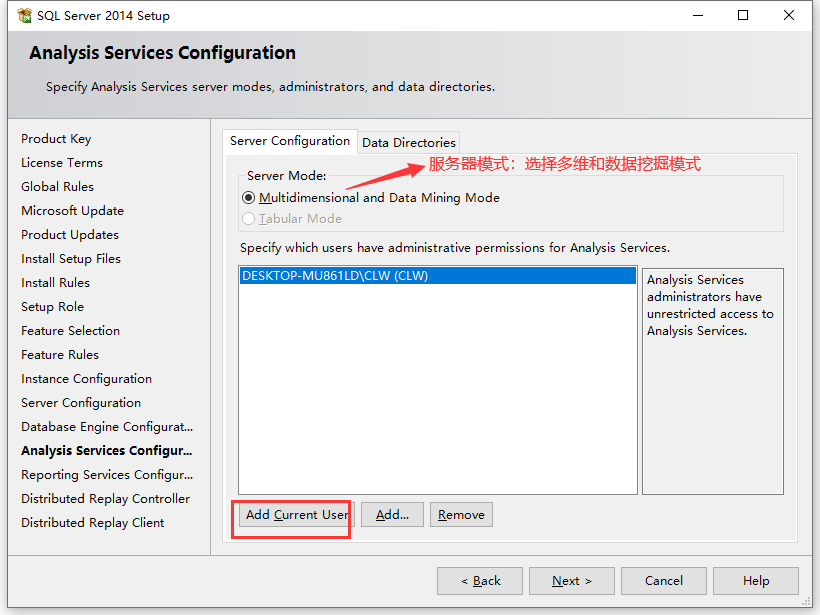 13. 选择SSAS服务配置,选择多维和数据挖掘模式。