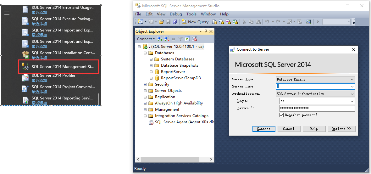 安装教程:http://jingyan.baidu.com/article/3a2f7c2e653d5926afd61197.html 安装好之后打开SQL server 2014 Managemen ...