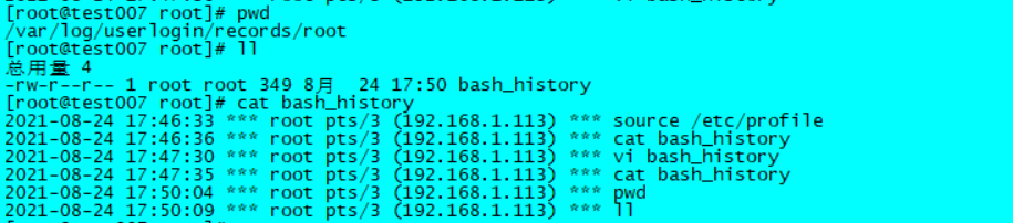 cd /var/log/userlogin/records/root # 进行一些简单的操作后查看 bash_history 中是否生成记录