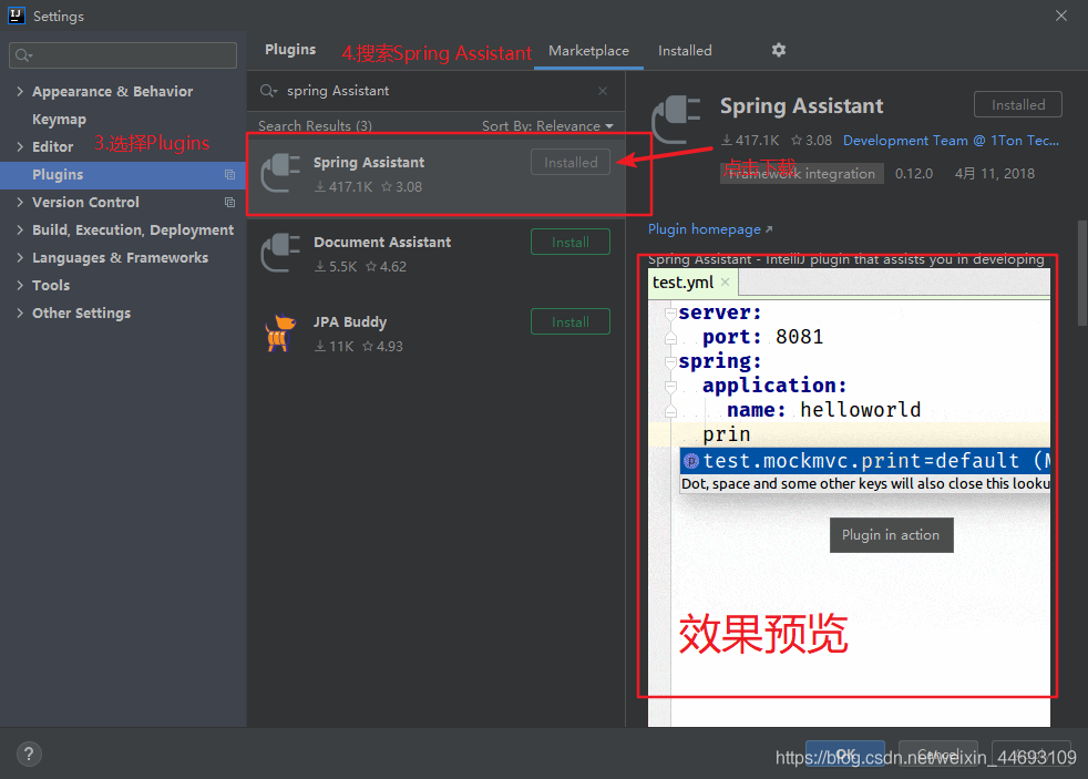 解决办法:File---->Settings---->Plugins---->搜索Spring Assistant