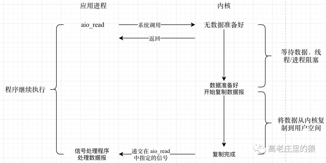 描述:应用进程通过 aio_read 告知内核启动某个操作,并且在整个操作完成之后再通知应用进程,包括把数据从内核空间拷贝到用户空间。信号驱动 IO 是内核通知我们何时可以启动一个 IO 操作,而一部 IO 模型是由内核通知我们 IO 操作何时完成。