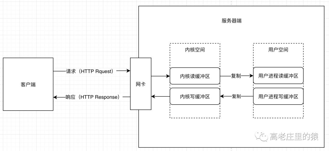 服务器端 IO 主要分为两种:磁盘 IO 和网络 IO,在讲服务器端高性能网络编程时更多时候我们讲的是网络 IO 模型。一次完整的服务器端处理网络请求流程图如下(简化版,以 Web 服务器为例):