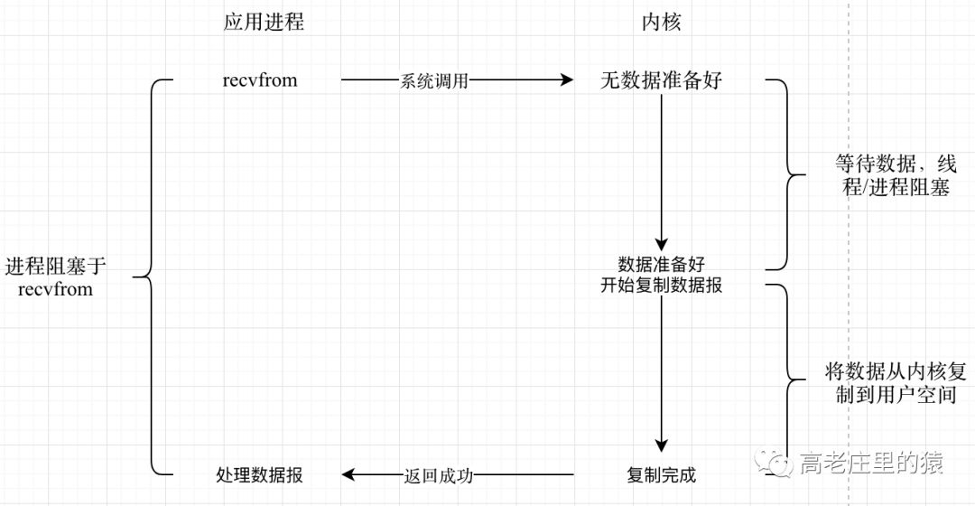 描述:应用程序进行 recvfrom 系统调用时将阻塞在此调用,直到该套接字上有数据并且复制到用户空间缓冲区。该模式一般配合多线程使用,应用进程每接收一个连接,为此连接创建一个线程来处理该连接上的读写以及业务处理。