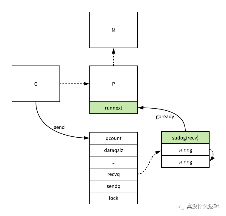 我们可以从下面图中简单了解一下如果 Channel 中存在等待消息的 Goroutine 时,发送消息的处理过程: