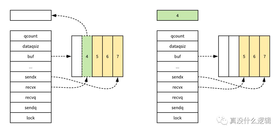 上图展示了 Channel 在缓冲区已经没有空间并且 sendq 中存在等待的 Goroutine 时,使用 <-ch 发生的变化,sendq 队列中的第一个 sudog 结构中的元素会替换 sendx/recvx 索引所在位置的元素,原有的元素会被拷贝到接收 <-ch 结果的内存空间上。