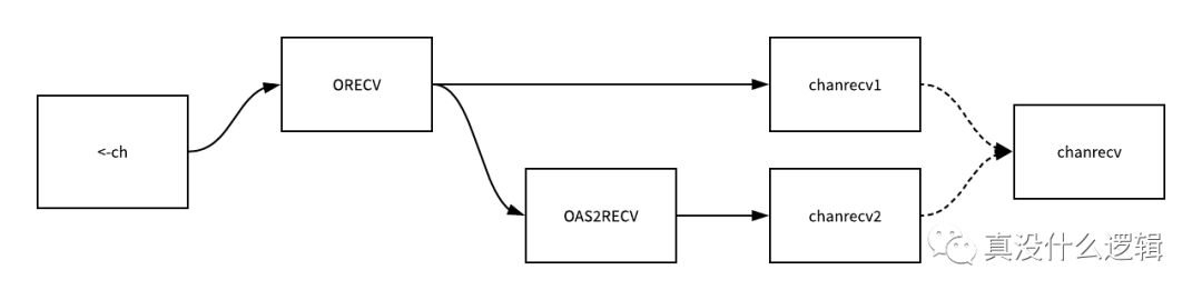 这两种不同的方法经过编译器的处理都会变成 ORECV 类型的节点,但是后者会在 类型检查[8] 阶段被转换成 OAS2RECV 节点,我们可以简单看一下这里转换的路线图: