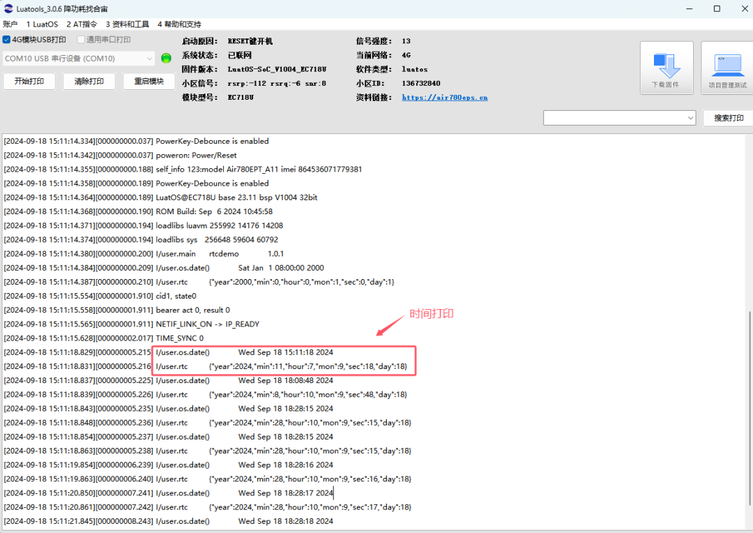 示例rtc.get/set是UTC时间,os.date为北京时间(东八区时间);实现设置、读取和打印时间数据,如下图所示: