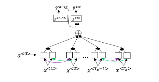 - 对于网络中与输出\(y^{<t>}\)高度相关的 \(\alpha^{<t>}\) 而言,我们通常希望 \(\alpha^{<t,t'>}\)的值更大。(请注意上标)