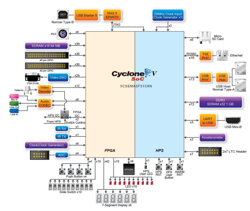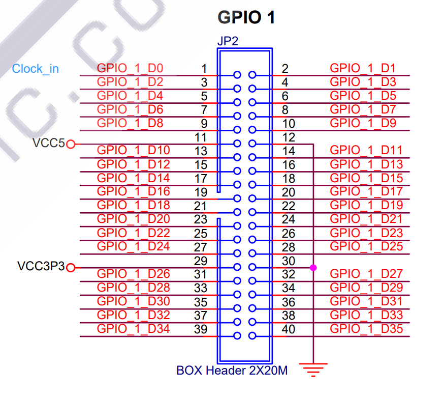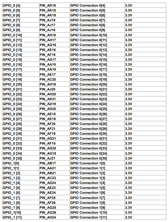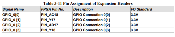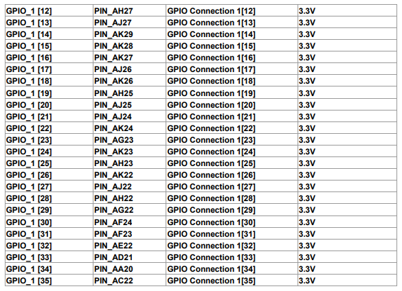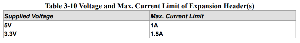 The board has two 40-pin expansion headers. Each header has 36 user pins connected directly to the Cyclone V SoC FPGA. It also comes with DC +5V (VCC5), DC +3.3V (VCC3P3), and two GND pins. The maximum power consumption allowed for a daughter card connected to one or two GPIO ports is shown in Table 3-10.