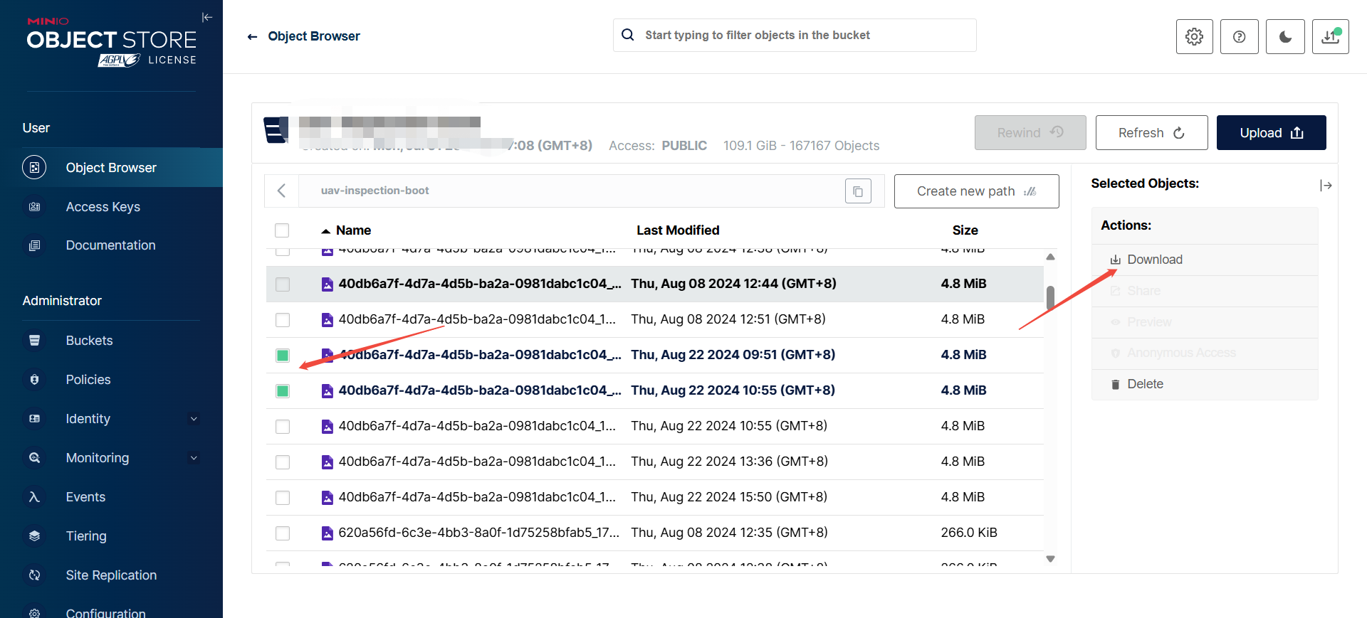 通过浏览器访问MinIO服务(http://:9000),进入对应的Bucket和文件夹,选择对应文件,点击下载。