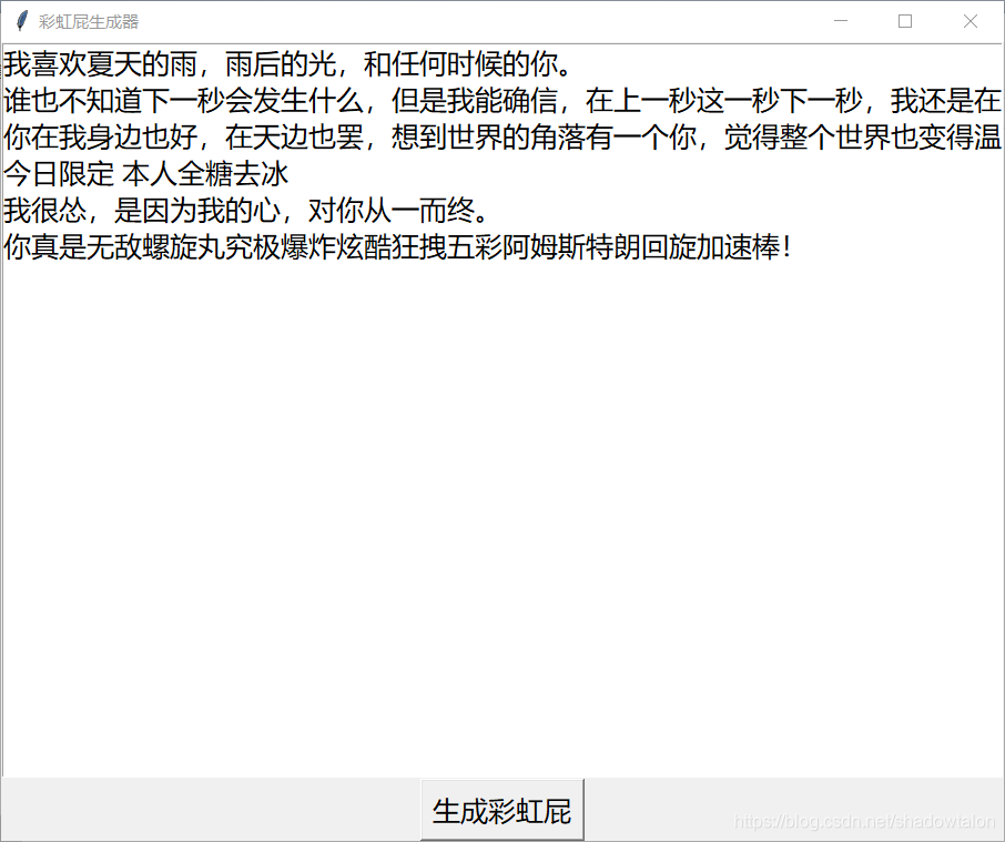 用Python爬虫对现有的api进行请求,获取彩虹屁,然后用tkinter模块形成一个可视化的gui,最后用pyinstaller对该py文件打包,这就是最后的彩虹屁生成器。