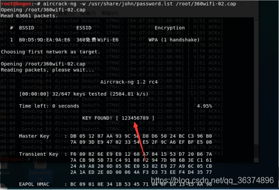 aircrack-ng -w /usr/share/john/password.lst /root/360wifi-02.cap //破解