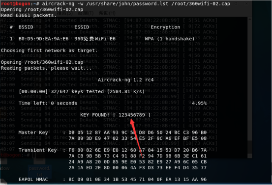 aircrack-ng -w /usr/share/john/password.lst /root/360wifi-02.cap //破解