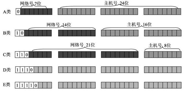 IP 地址被分类以后,如何判断一个 IP 地址是 A 类、B 类还是 C 类地址呢?为了更好地进行区分,将每类地址的开头部分设置为固定数值,如图所示。