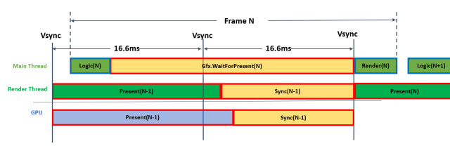 Graphics.PresentAndSync 是指主线程进行Present时的等待时间和等待垂直同步的时间。Gfx.WaitForPresent其字面意思同样也是进行Present时需要等待的时间,但这里其实省略了很多的内容。其真实的意思应该是为了在渲染子线程(Rendering Thread)中进行Present,当前主线程(MainThread)需要等待的时间。听起来依然很拗口,下面,我们就来进行详细地解释。
