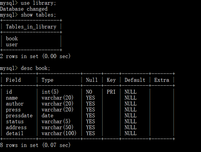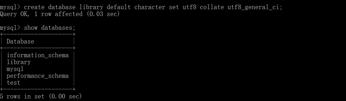 create database library default character set utf8 collate utf8_general_ci; # 创建数据库并设置默认字符集