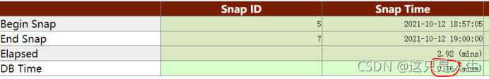 在满负荷的情况下,DB time 会等于 Elapsed Time(快照时间)* CPU 个数,说明每一个 CPU 都在执行数据库业务。