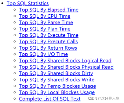 TOP SQL 从多个维度展示了耗时耗资源最多的 SQL 语句,有了这些报告,可以很容易找出消耗资源最多的 SQL 语句,然后具体分析。