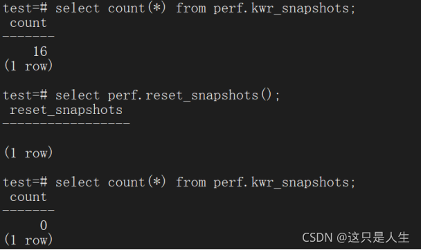 如果之前产生的快照不想要了,可以执行 perf.reset_snapshots() 函数清理全部的快照: