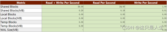 IO 方面需要重点关注的指标有 WAL Size - WAL 日志 IO 大小,和 Blocks Read/Write Size - 数据页读和写的大小,这应该是物理读写的大小。