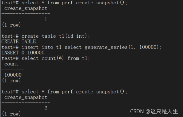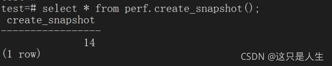 手动快照则是由 DBA 通过 SQL 语句执行生成快照,执行 perf.create_snapshot() 函数,返回快照编号: