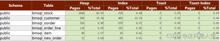 比如 Top Tables By Logical Read 查看物理读的情况,它不仅展示了表的物理读,还展示相关联的索引表、Toast 表的物理读情况。对这些物理读很高的表和索引要特别关注一下。