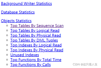 这一部分是从数据库对象:后台写统计、数据库统计和数据库对象(表、索引和自定义函数)统计显示各数据库对象的资源消耗的。
