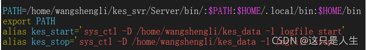 编辑 ~/.bash_profile 配置环境变量,将 KES 的 bin 目录添加到 PATH,并添加 2个快捷命令: