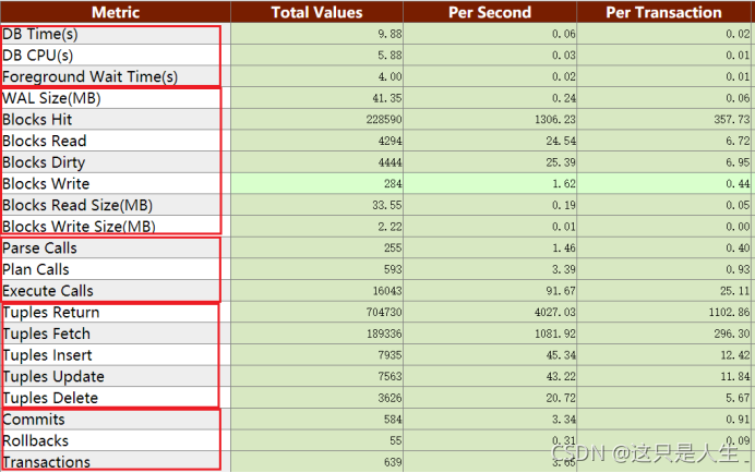 这个报告非常的有用,我比较喜欢的一点是这里提供了每秒(Per Second)、每事务(Per Transaction)的统计功能,可以比较直观的知道每秒写了多少WAL日志,每秒执行了多少元组的插入和删除等。