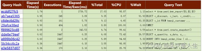 以 Top SQL By Elapsed Time 为例,该报告按 SQL 完整执行完成时间排序,显示了总花费时间、执行次数、平均每次的执行时间、执行时间占比和 SQL 文本等信息。点击 Query Hash 链接还可以查看完整的 SQL 语句。