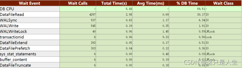 这个报告里可以看到 DataFileRead 等待事件发生了 2497 次,DB Time 比例超过 30%,说明发生了严重的 IO 等待,存在大量的物理读。可以通过加数据页预先加载到内存的方式来较少物理读。