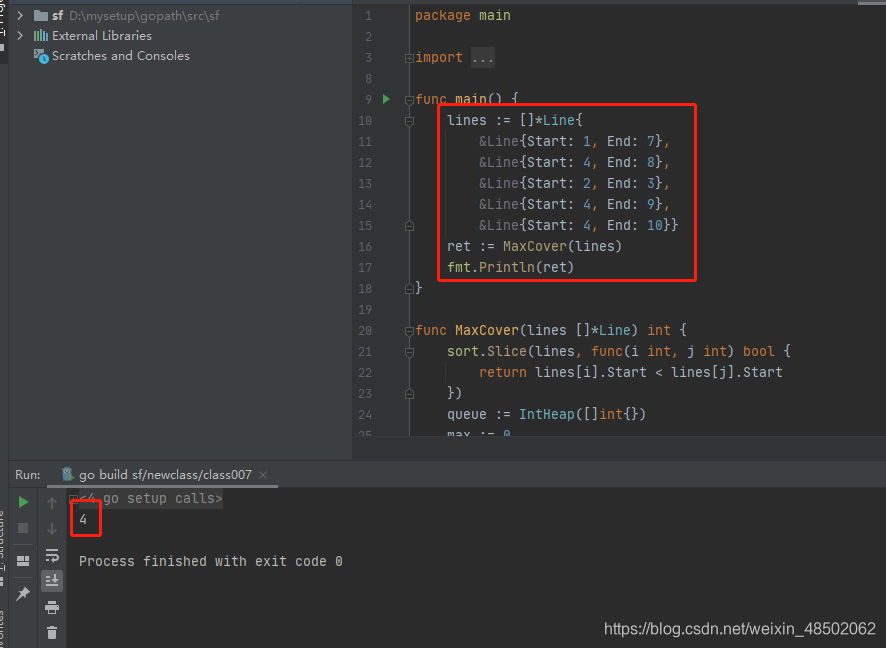 2021-04-22:给定很多线段,每个线段都有两个数[start, end],表示线段开始位置和结束位置,左右都是闭区间,规定:1)线段的开始和结束位置一定都是整数值,2)线段重合区域的长度必须>=1。返回线段最多重合区域中,包含了几条线段 。