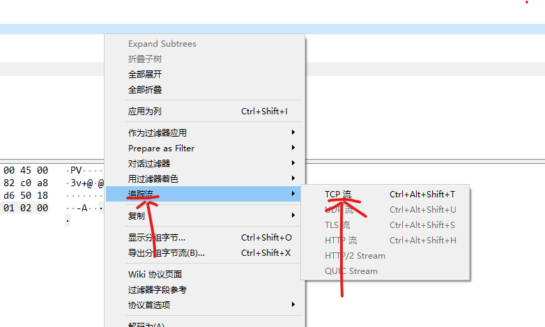 然后鼠标右键选择追踪流,再选择TCP流