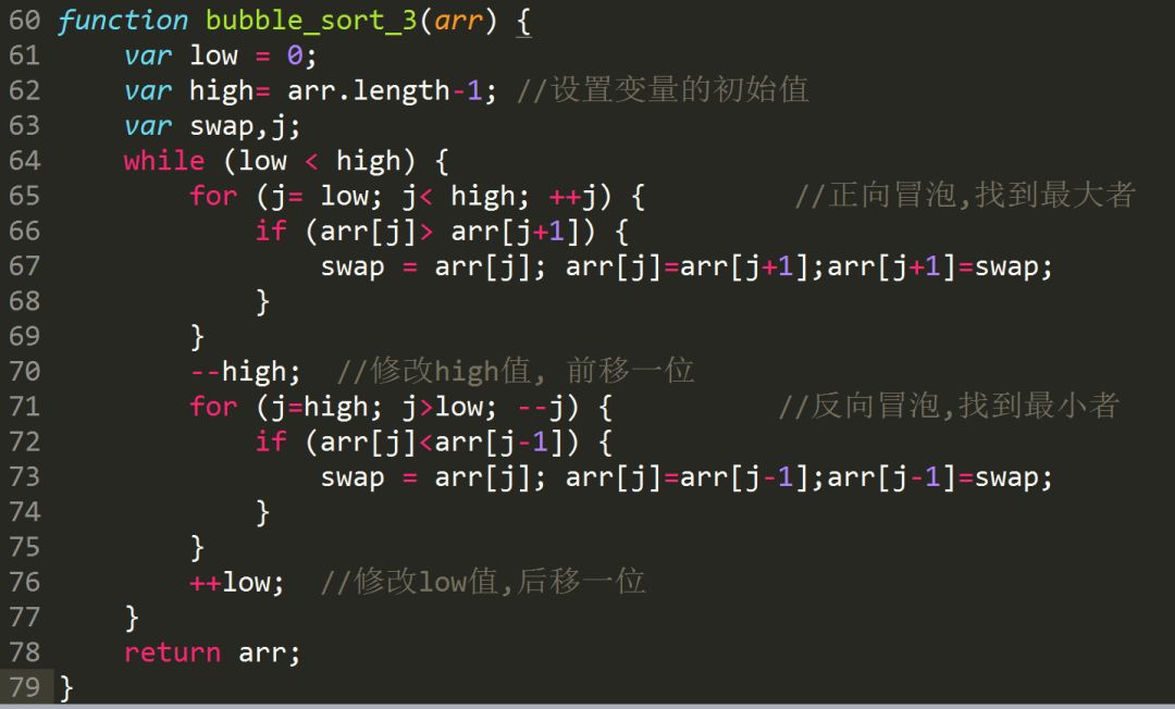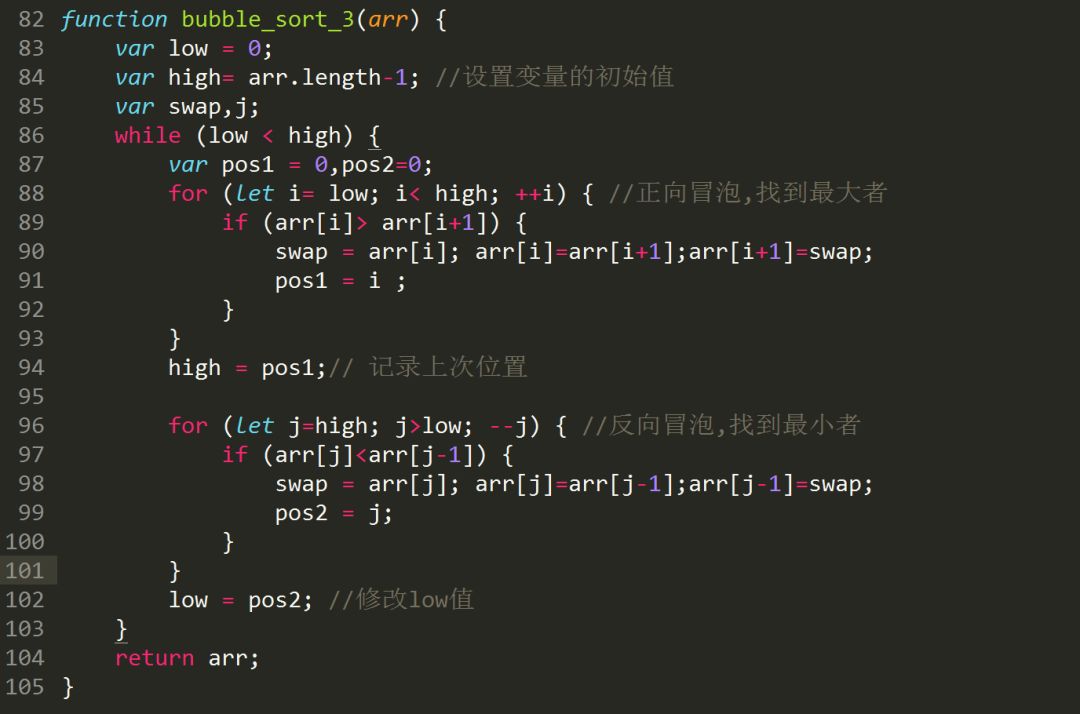 假如数组长度是20,如果只有前十位是无序排列的,后十位是有序且都大于前十位,所以第一趟遍历排序的时候发生交换的位置必定小于10,且该位置之后的必定有序,我们只需要排序好该位置之前的就可以,因此我们要来标记这个位置就可以了,即可以记录每次扫描中最后一次交换的位置,下次扫描的时候只要扫描到上次的最后交换位置就行了,因为后面的都是已经排好序的,无需再比较,代码如下: